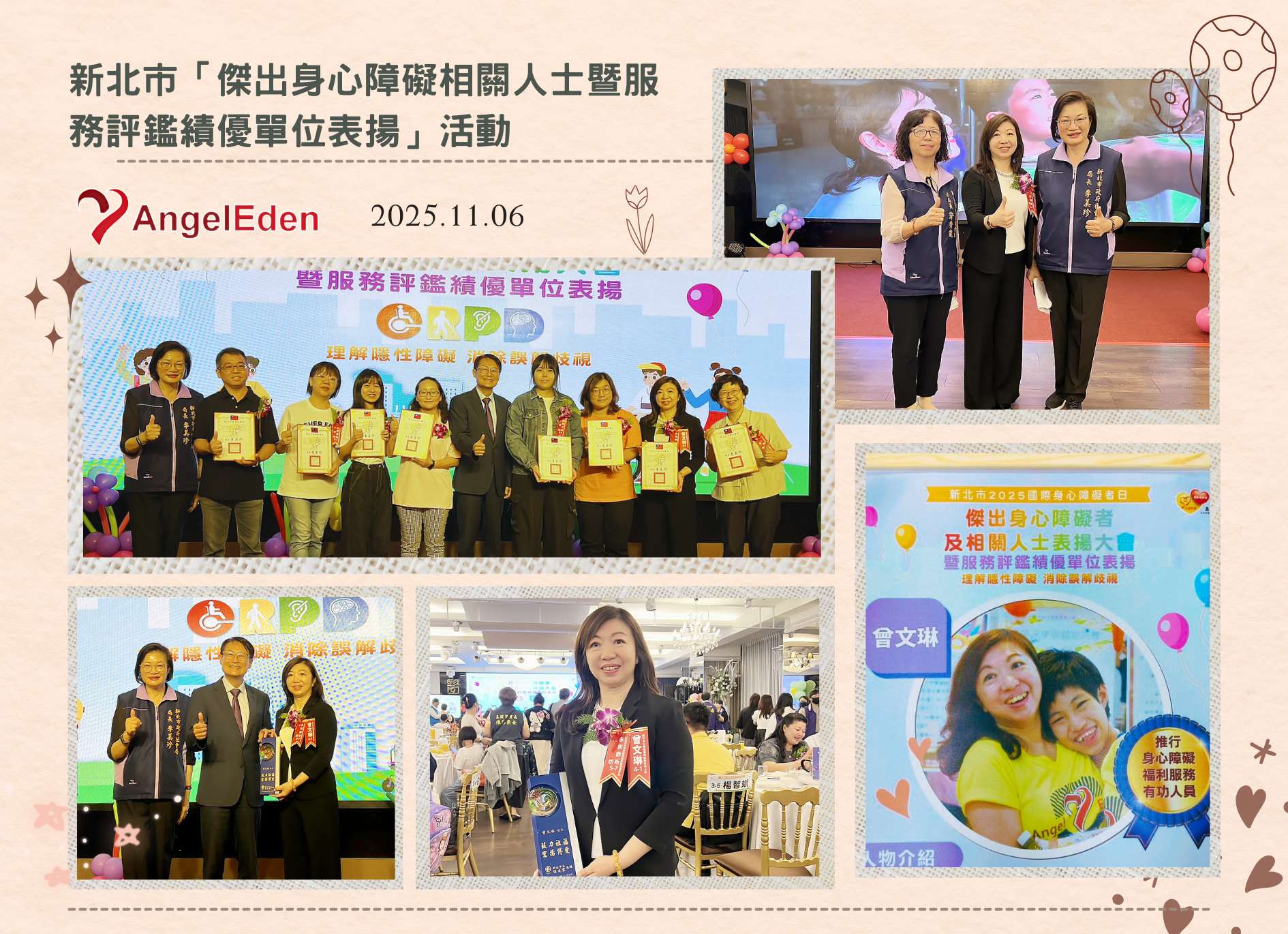 11月6日,新北市政府社會局舉辦「傑出身心障礙相關人士暨服務評鑑績優單位表揚活動」,響應今年主題「理解隱性障礙 消除誤解歧視」,表揚在身障福利領域中深耕奉獻的單位與人員。 本會創會理事長 曾文琳 榮獲「新北市身心障礙福利服務有功人員」, 由協會承辦的 歡昕工坊 也獲頒「社區式支持照顧服務評鑑優等」殊榮。 能與眾多致力於身障服務的夥伴齊聚一堂,交流彼此的經驗與努力,我們深感榮幸與感動。這份肯定屬於所有持續關心與支持天使樂園的夥伴們——理監事、家長、工作團隊、志工與社會各界朋友,因為有大家的信任與同行,天使樂園才能一步步讓更多慢飛天使在愛的陪伴中展翅前行。 未來,我們將繼續秉持初衷,深化社區支持、推動多元就業與身心健康服務, 讓「理解」成為連結彼此的力量,讓「共好」成為社區最溫暖的風景。
