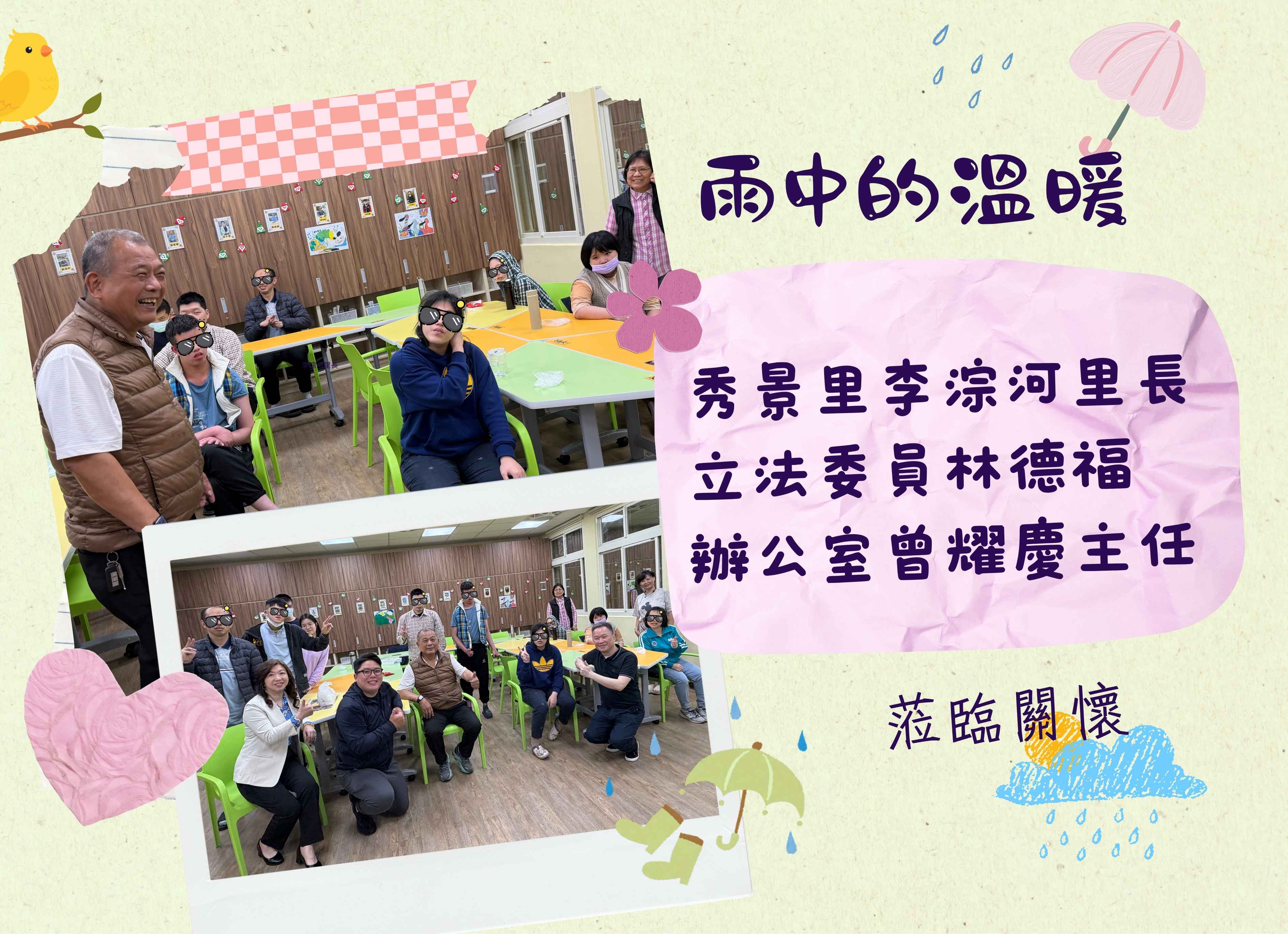 在雨中前來尖山腳日照中心,關心學員與據點運作。
