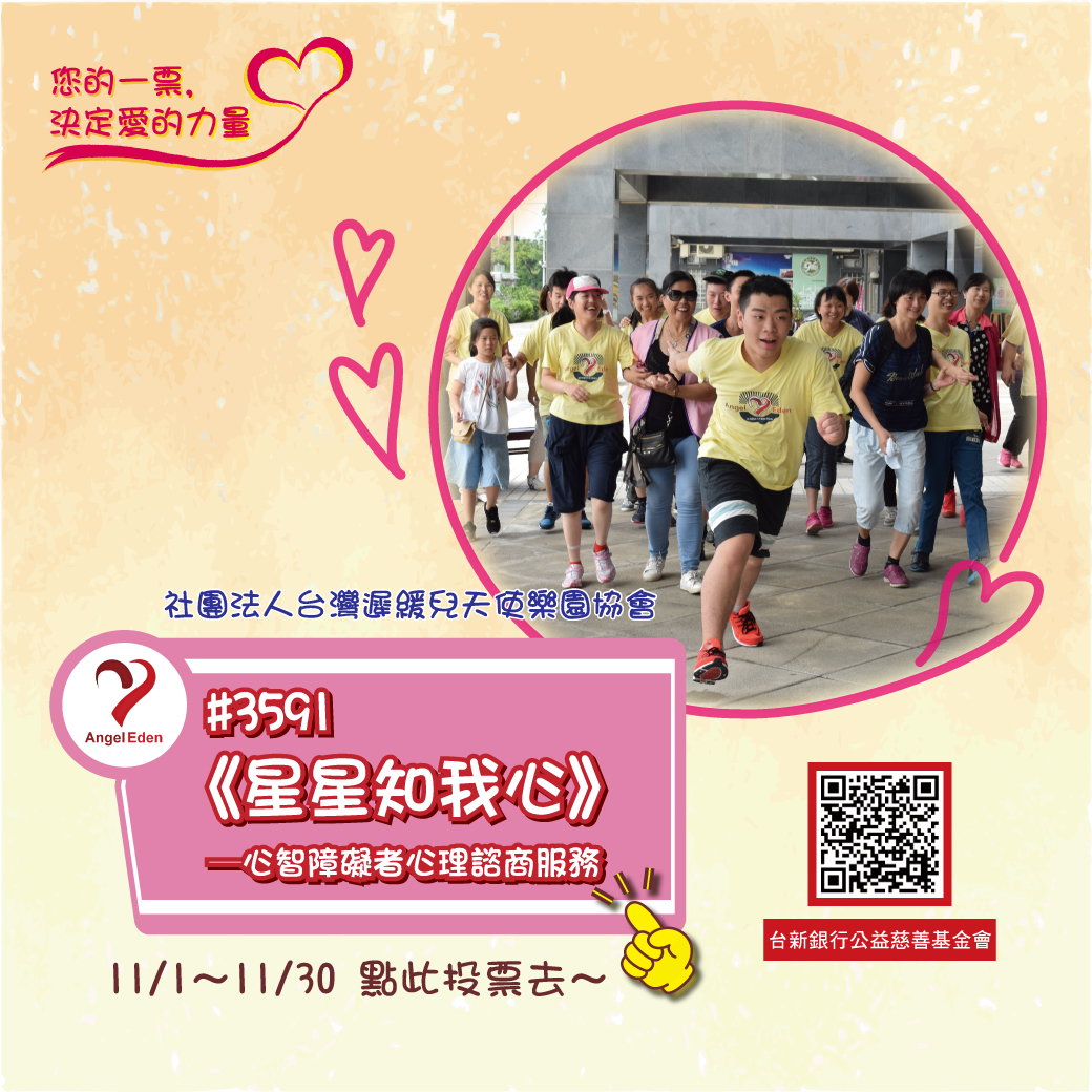 台灣遲緩兒天使樂園協會參加台新銀行「您的一票,決定愛的力量」公益提案,目前已進入投票階段,非常需要大家的支持! 懇請各位在11/1~11/30投下您神聖的一票,支持提案編號 #3591《星星知我心》 ! 並請大家務必轉發分享給您的親朋好友們! 支持天使樂園投票去 https://www.taishincharity.org.tw/lovepower/detail-report_3591.html